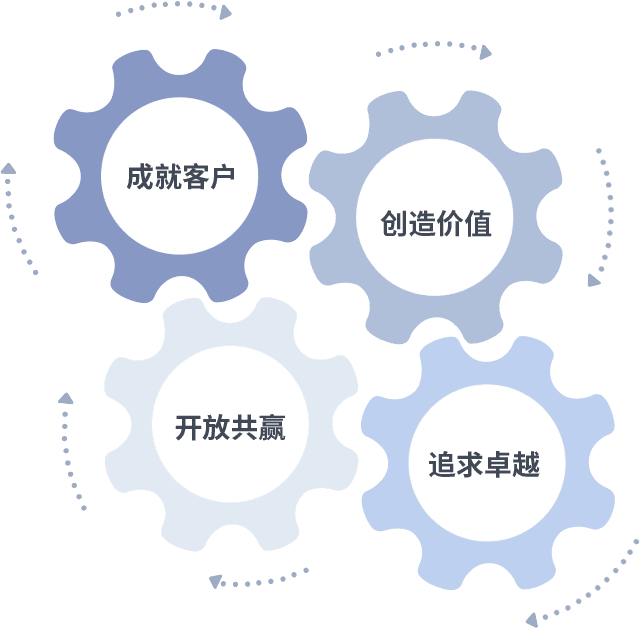成就客戶是一切決策的出發點,,創造價值是衡量所有工作的標準,,追求卓越是我們做事做人的態度,,開放共贏是我們的格局也是最終的結果。。。價值觀的齒輪環環相扣,,,推動著組織里的每個人不斷向前。。。。