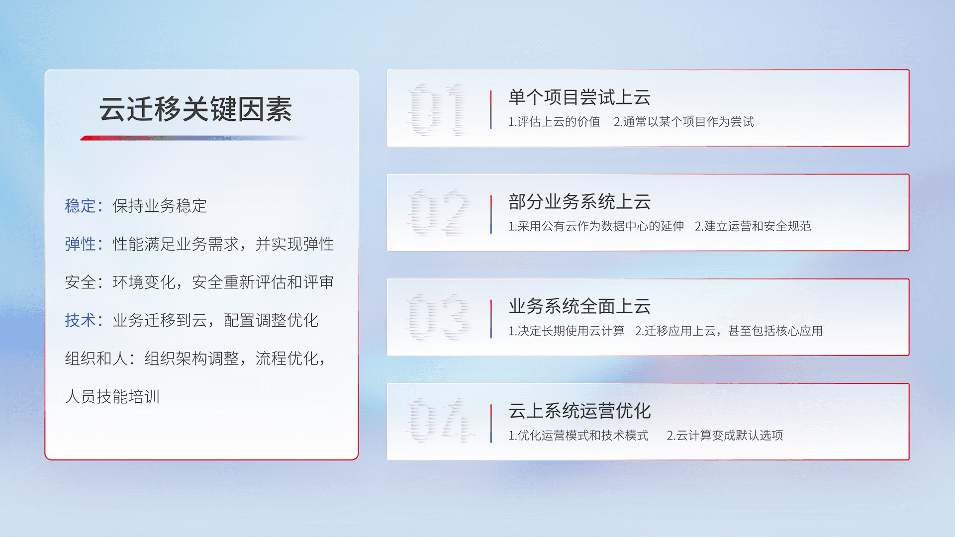 結合實際業務,,,,從規劃設計、、、、云平臺選型、、、、云原生改造、、、數據遷移、、集成交付,,,,遷移全過程為客戶識別最佳上云路徑,,做好風險識別管理,,,設計網絡架構、、、、身份權限、、、、安全審計合規、、、、操作審計、、、日志審計、、、、監控告警策略、、、、多站點容災設計等,,,對云上基礎設施進行整體規劃,,,,提升IT治理水平,,以滿足彈性、、高可用、、、、高性能的需求。。。