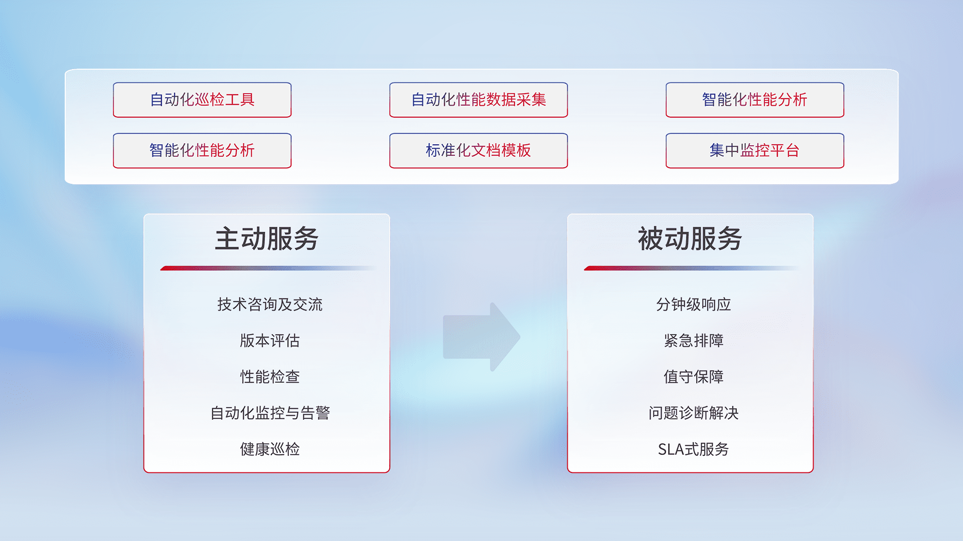智能化工具和標準化文檔,,保障服務質量,,提供主動服務(包含技術咨詢、、版本評估、、性能檢查、、自動化監控與告警、、、、健康巡檢)和被動服務包含(分鐘級響應、、、緊急排障、、值守保障、、問題診斷解決、、SLA服務)。。。。