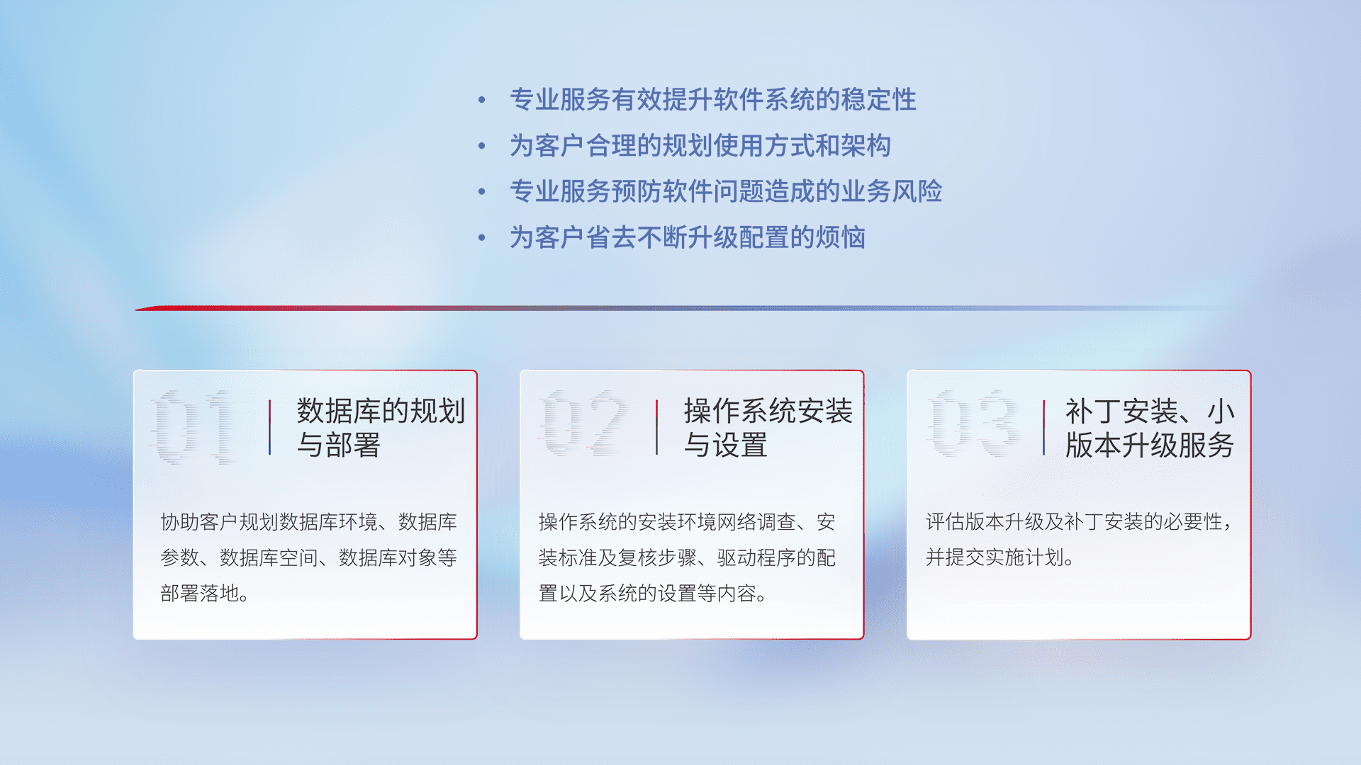 為客戶提供軟件規模升級、、快速部署、、按需配置的專業服務,,,,從數據庫的規劃與部署到操作系統的安裝與設置,,,再到補丁安裝和小版本升級提供支持。。。。