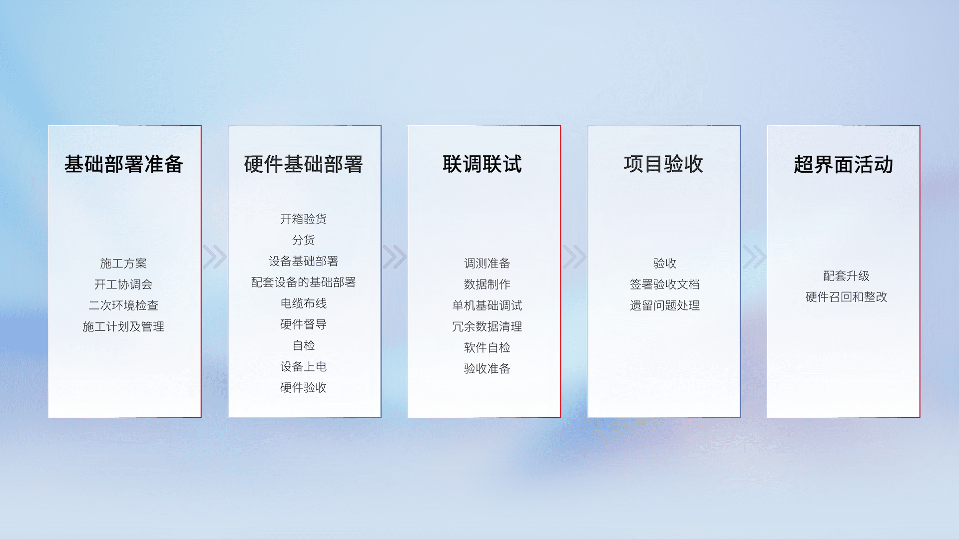 從基礎部署準備、、硬件基礎部署、、、、聯調聯試、、、項目驗收、、越界面活動的全過程可追溯,,保證施工質量和進度。。